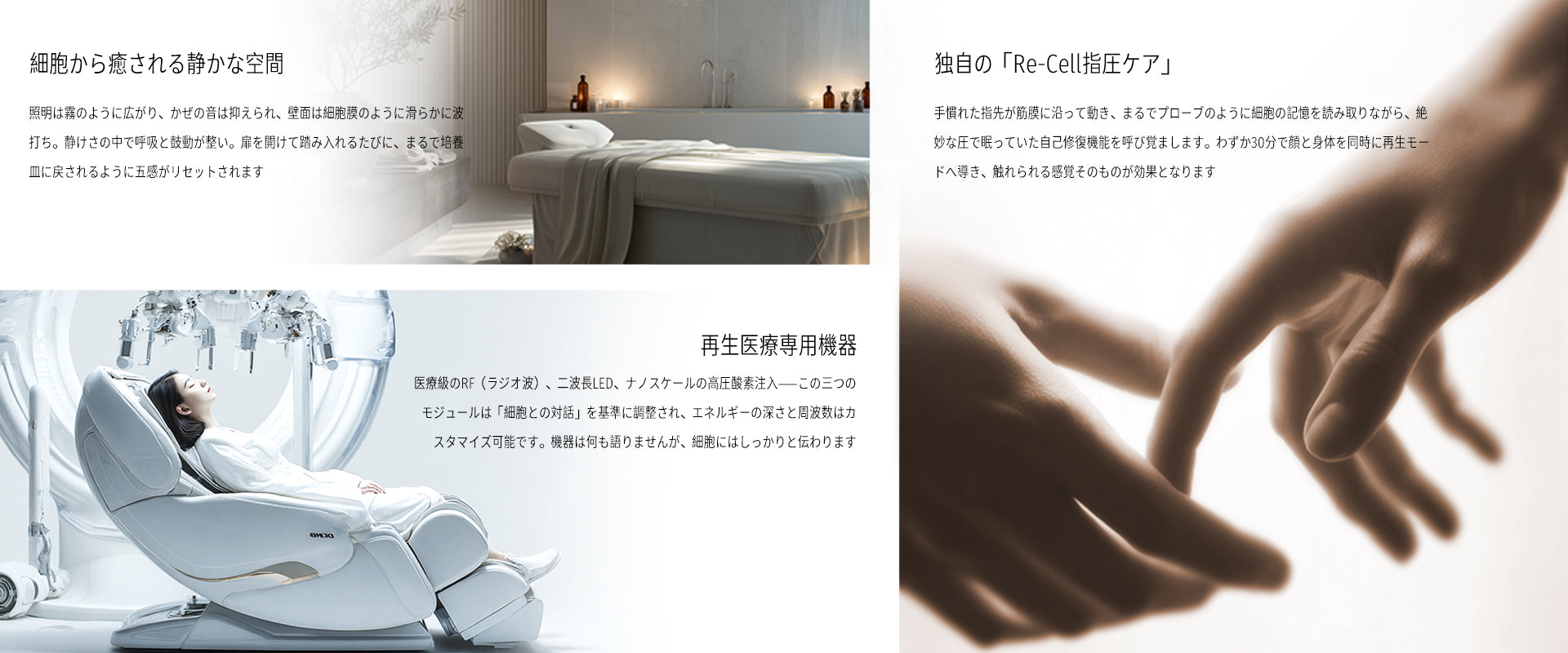 細胞レベルで静かな空間のもと、再生医療と指圧ケアを融合し、顔と身体が本来持つ若返りのリズムを呼び覚まします。